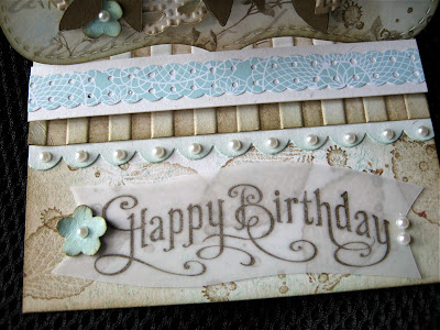 This detail shows the interplay of shape and textures. It is so much fun adding dimension to a card. I've used the circular motif from the Perfect Pennants die as the basis for the main focus of the card, then built on it with punching a scalloped circle of DSP. The flower is also made from 4 scallop circles that have been distressed and split, sponged and spritzed.